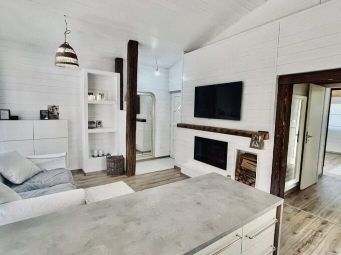 A ház melegről elektromos kazán gondoskodik, padlófűtéses hőleadással, a fürdőszobában+ törölközőszárítóval.