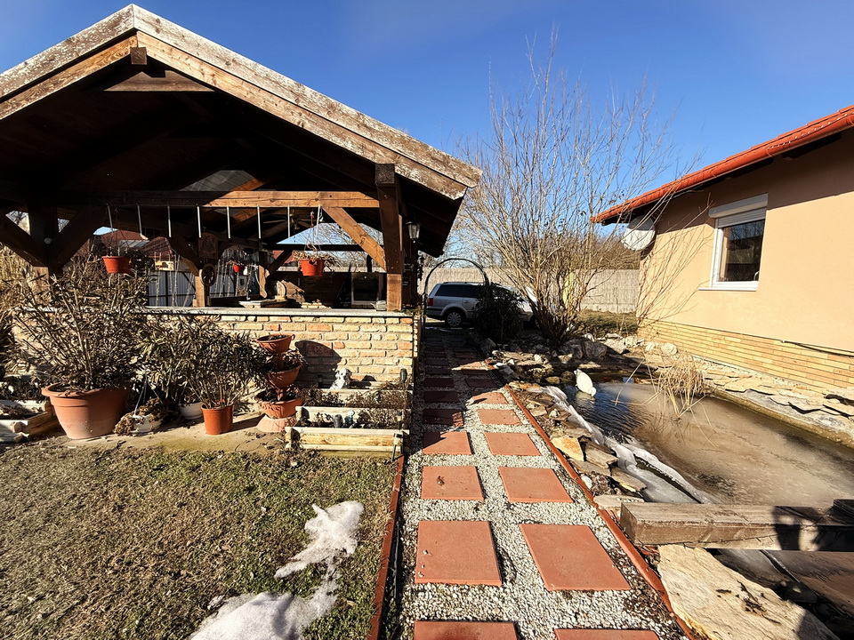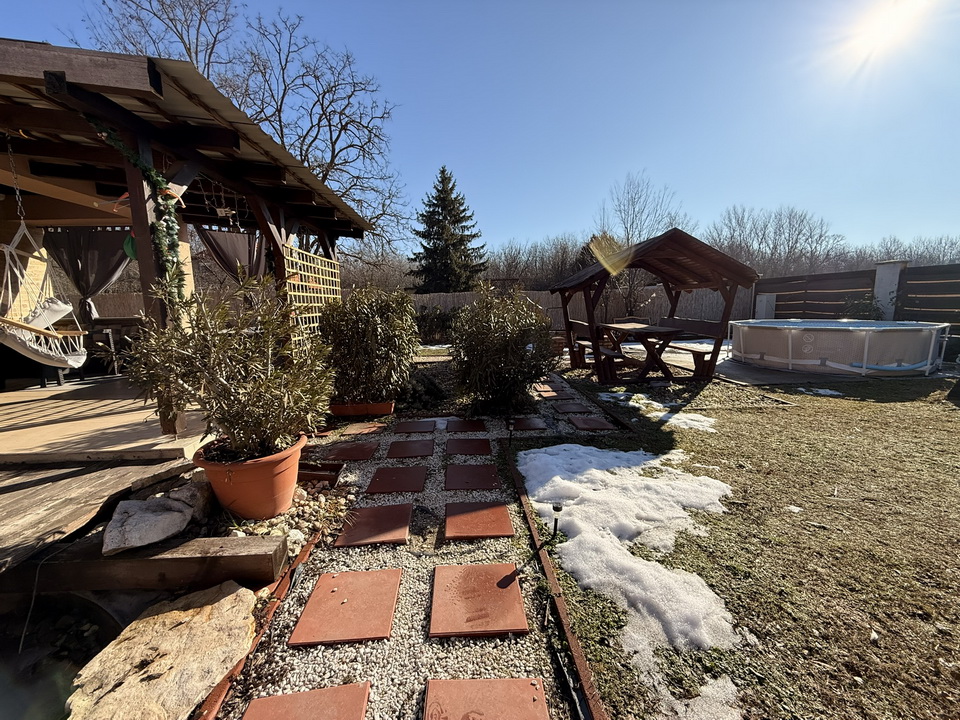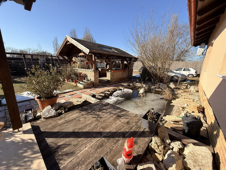 A gondosan kialakított 1149 m2.es kert tökéletes helyszínt biztosít a pihenéshez és a baráti, családi összejövetelekhez. A telken helyet kapott egy hangulatos kerti tó, valamint egy tágas, 20 m²-es fedett terasz. A szabadtéri élményt egy hatfős jakuzzi teszi teljessé.