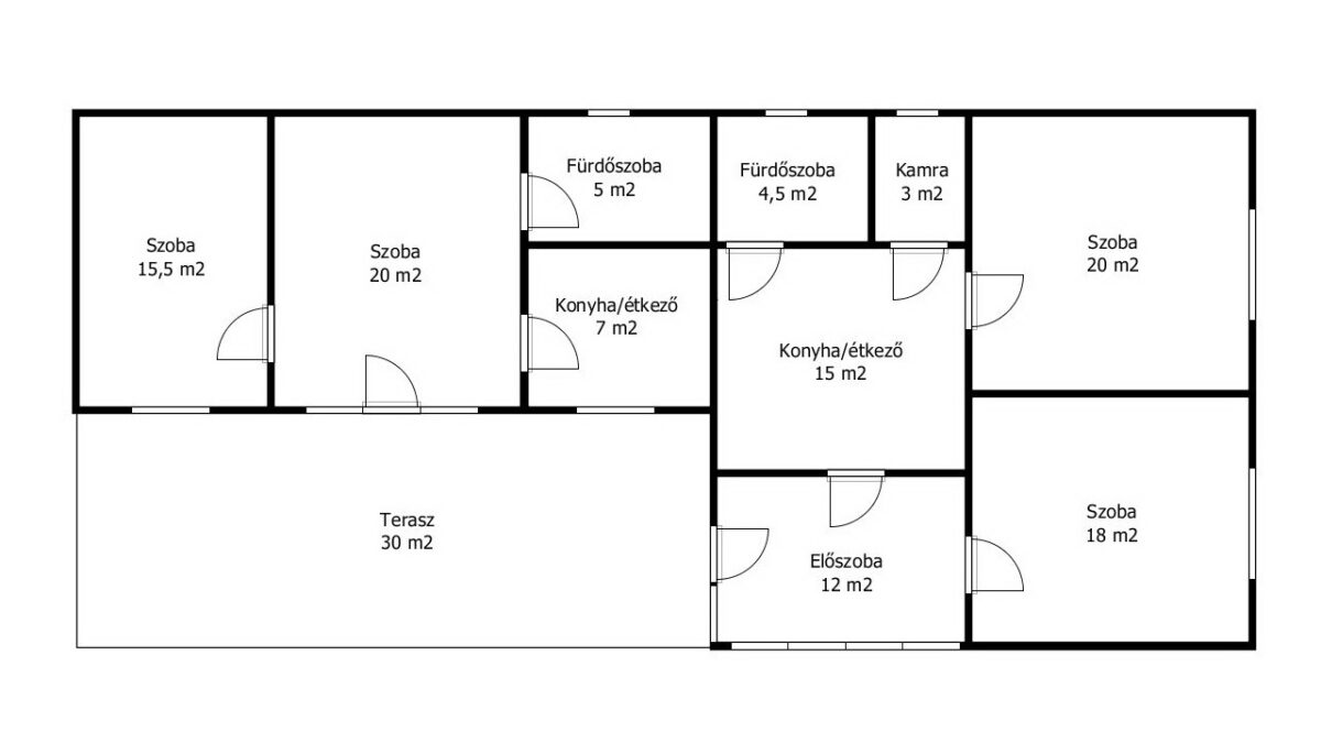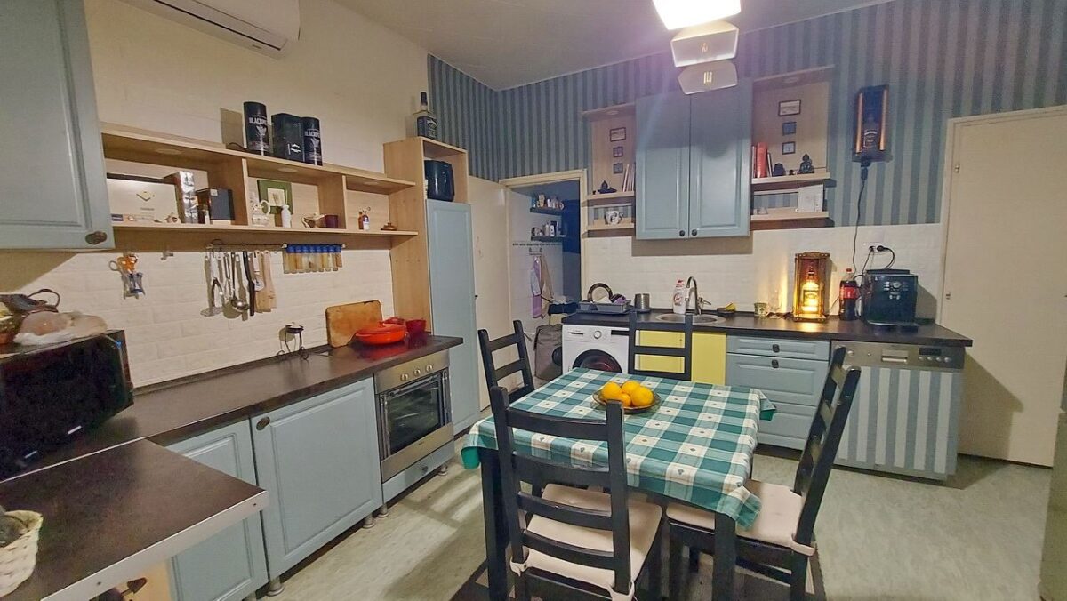Szintén az előszobából nyílik a konyha-étkező helyiség (15 m2), ahol a klíma és a nagy teljesítményű fa tüzeléses kandalló is található. A kamra (3 m2) a konyhából nyílik.