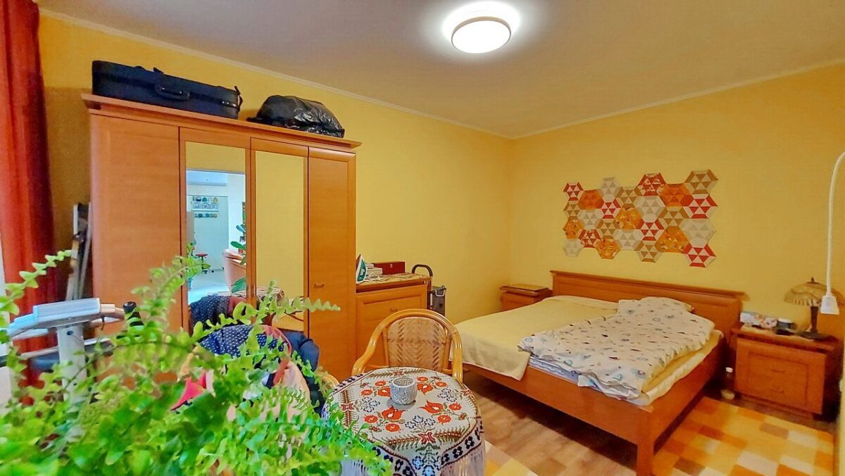 A lakrész hálószobája (15,5 m2) a nappaliból balra nyílik, a hálószoba ablaka a kert felé a terasz irányába néz.