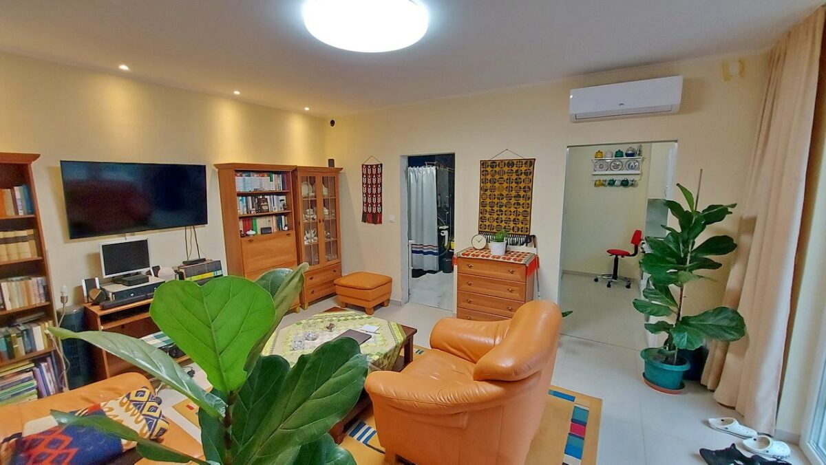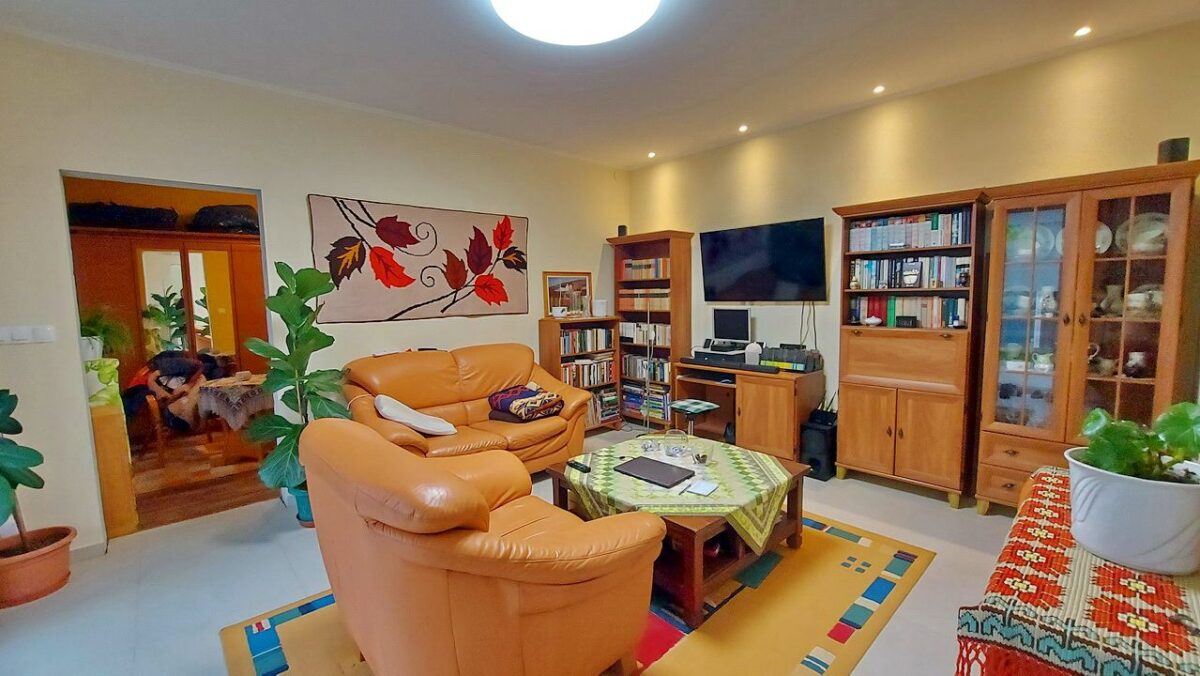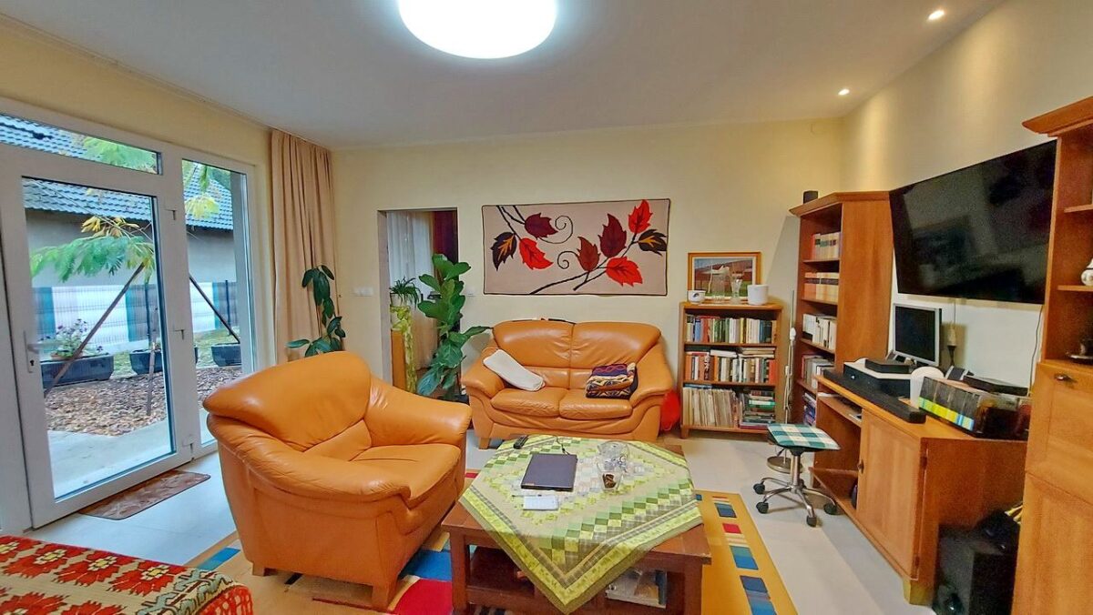 Ebbe a lakrészbe is a teraszról lehet belépni. A bejárati ajtó mellett mindkét oldalon nagy üvegfelület ad természetes fényt a nappalinak (20 m2), amelybe érkezünk. A lakás tejes területén padlófűtés ad kellemes hőmérsékletet a fűtés szezonban. A padlózaton hidegburkolat van.
