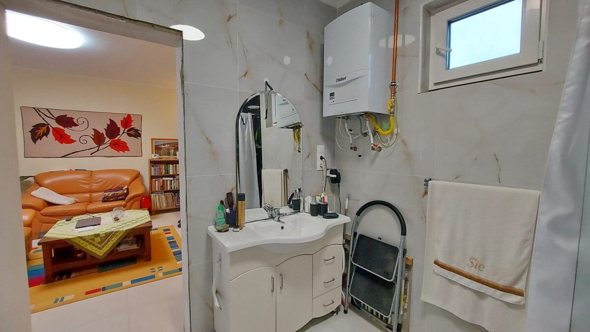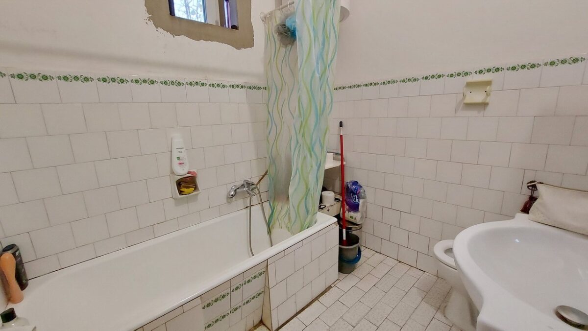 A fürdőszoba (4,5 m2) szintén a konyha-étkező helyiségből nyílik, a padlózaton és a falakon hidegburkolat van. Ablakának köszönhetően természetes módon szellőztethető. A fürdőszobában kád, wc és kézmosó is van.