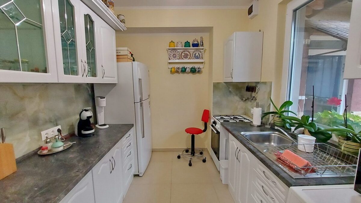 A konyha (7 m2) a nappaliból jobbra nyílik, a fűtött padlózaton itt is kerámia járólap a burkolat. A helyiség ablaka szintén a teraszra, a kert felé néz.
