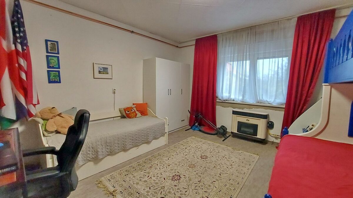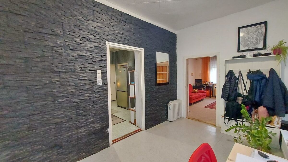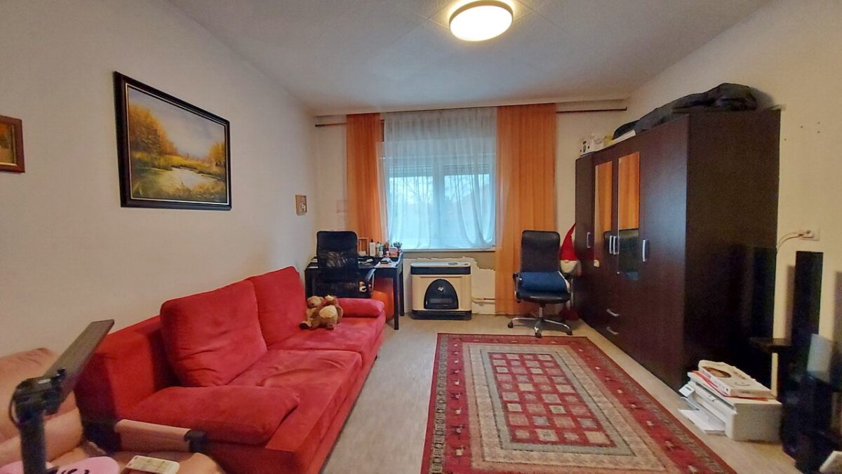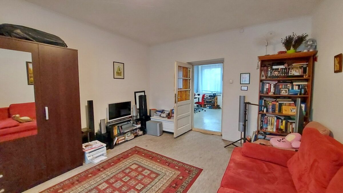 A nagyobb szoba (20 m2) a konyhából nyílik és ennek a szobának is az utca felé tekint az ablaka.