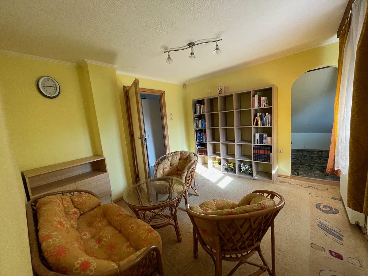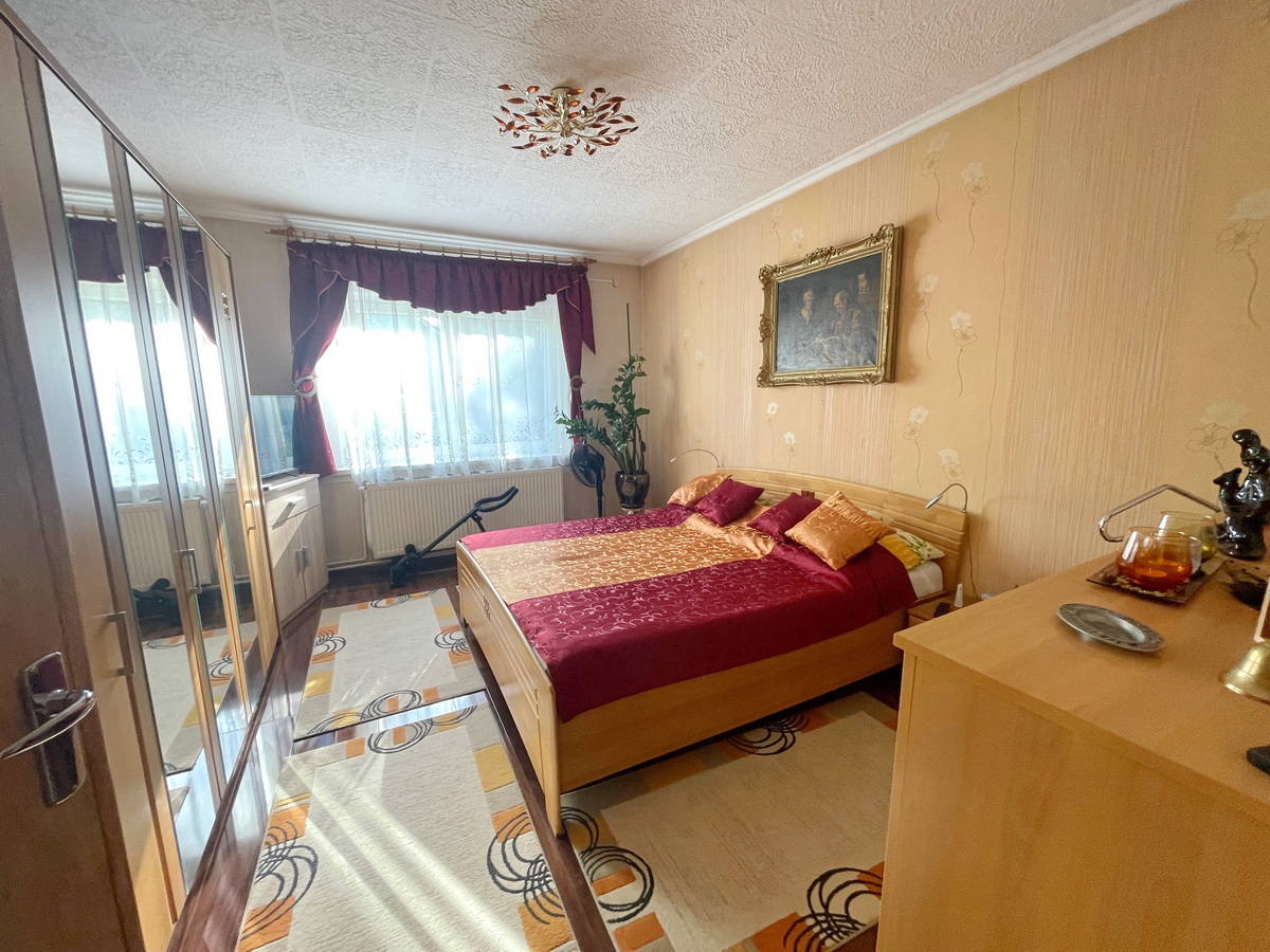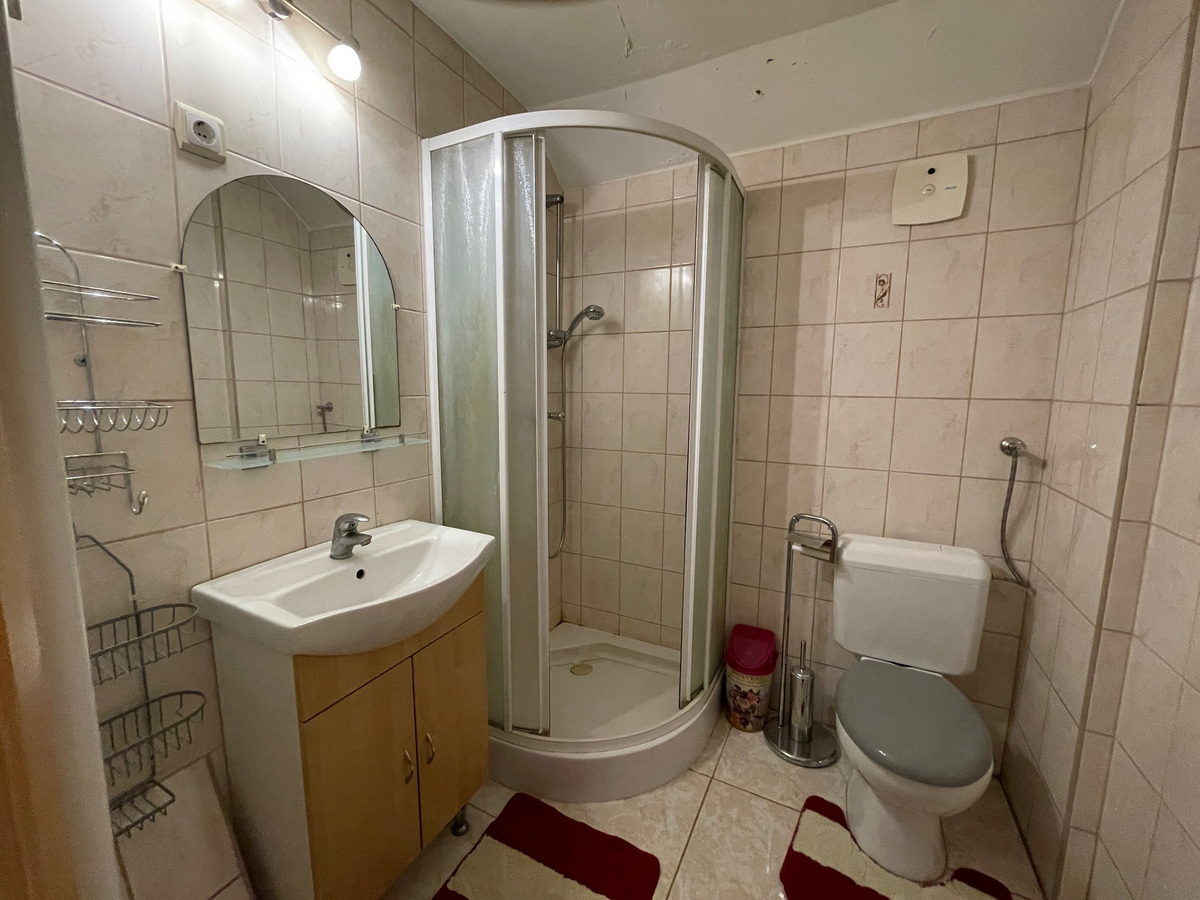 balra 2 külön bejáratú 19 m2 -es szoba, szemben a káddal és tusolóval is felszerelt fürdőszoba és Wc. A folyosóról érhető el az emelet és a szuterén szint is.
