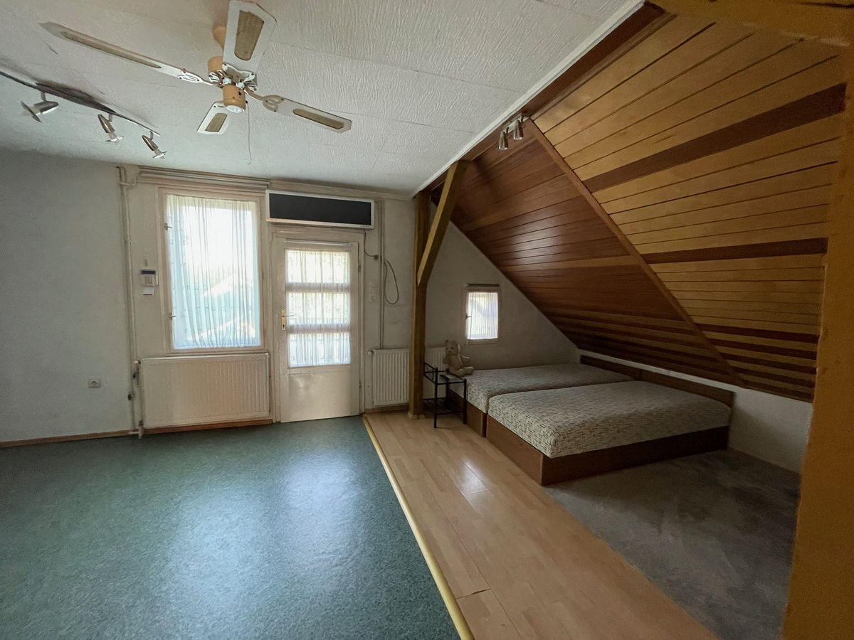 Az egybe épített és akár egybenyitható 2×25 m2-es helyiség fűthető, vizesblokkal ellátott, kisebb ráfordítással akár lakható is. Jelenleg műhelyként, tárolóként funkcionál.