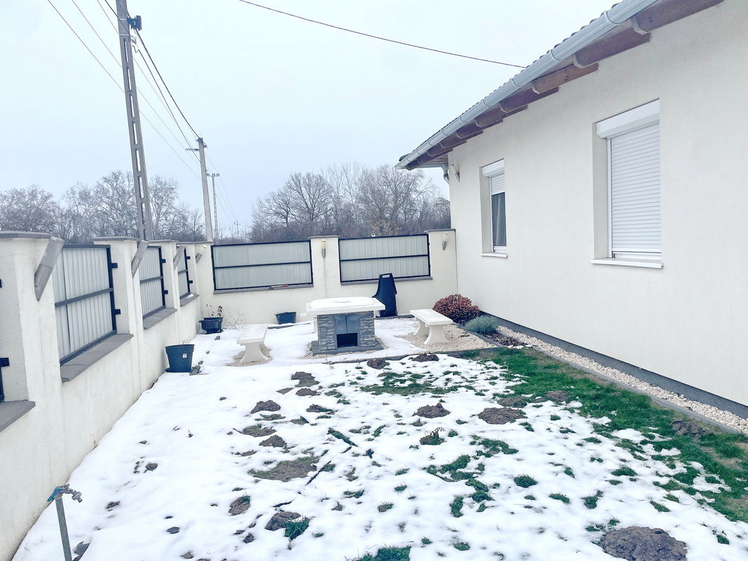 A 300 m2-es telek körbe kerített, rendezett, fúrt kúttal és kerti sütögetővel.