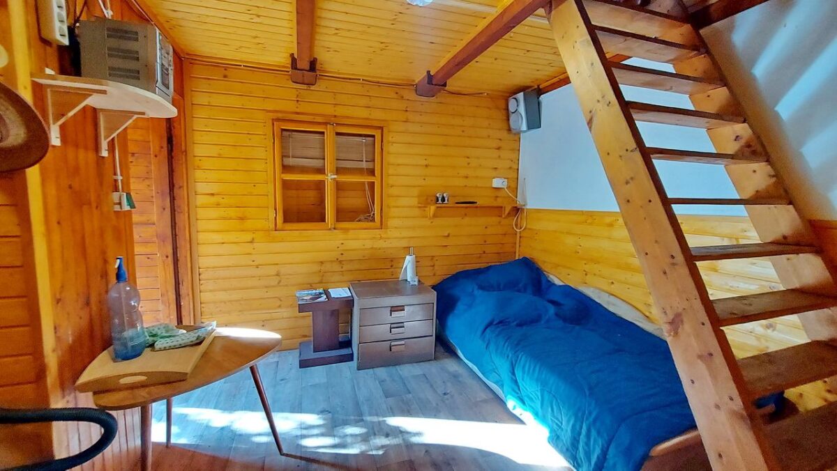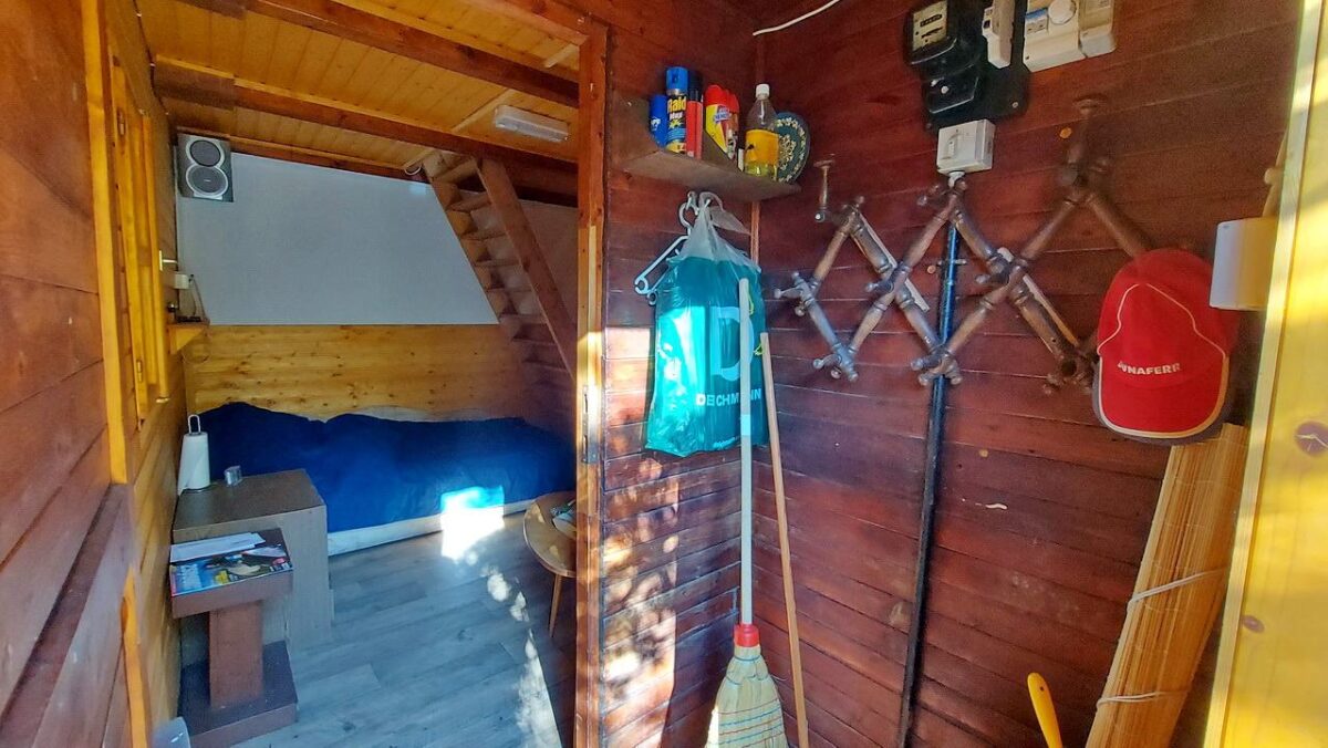 A nyaralóba lépve egy előtérbe (1,5 m2) érkezünk, amelyből az alsó szint szobája (9 m2) nyílik.