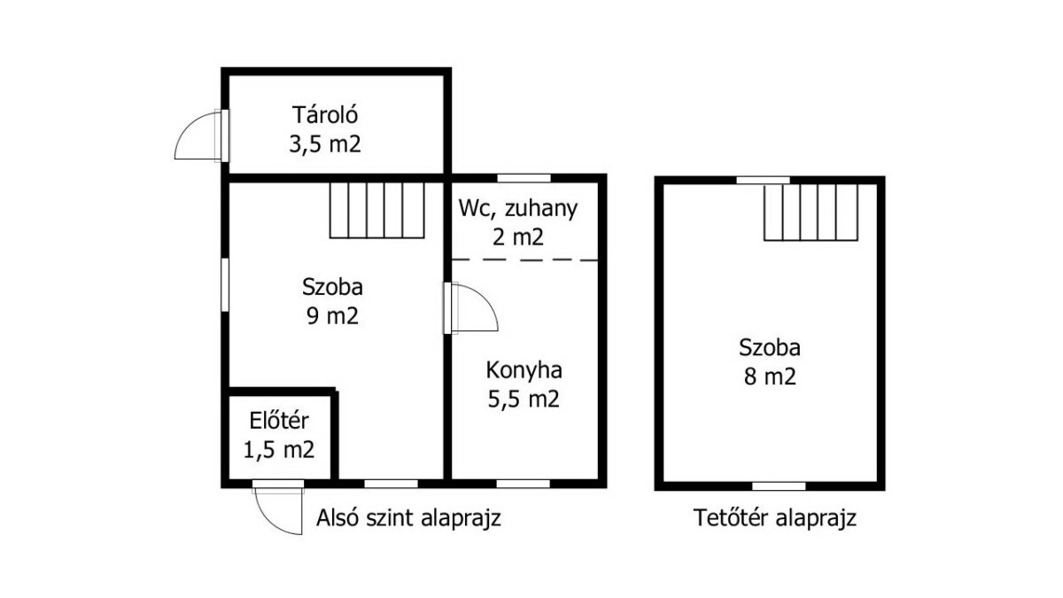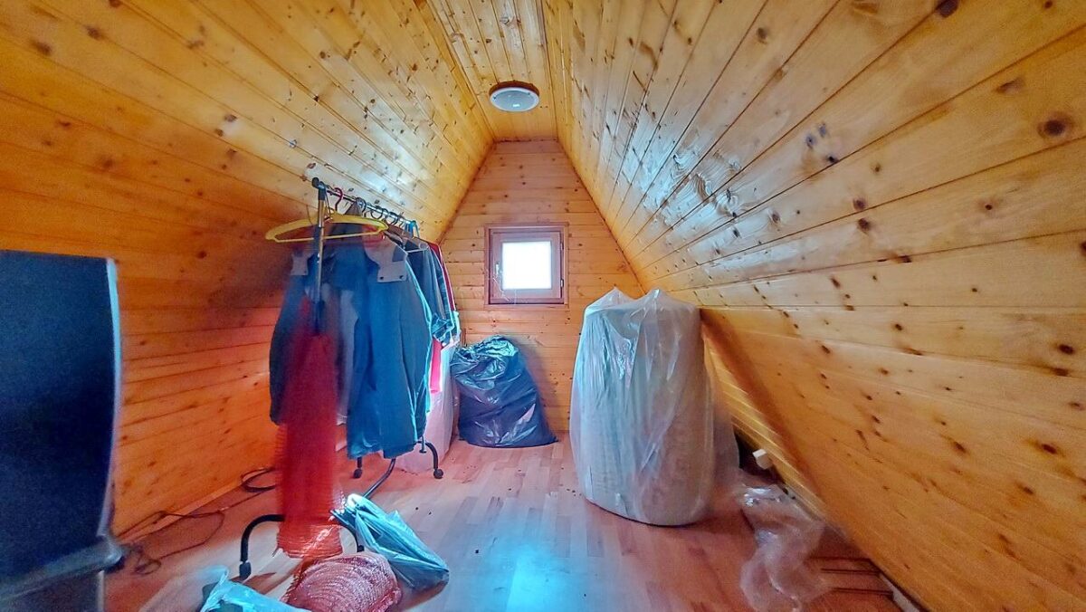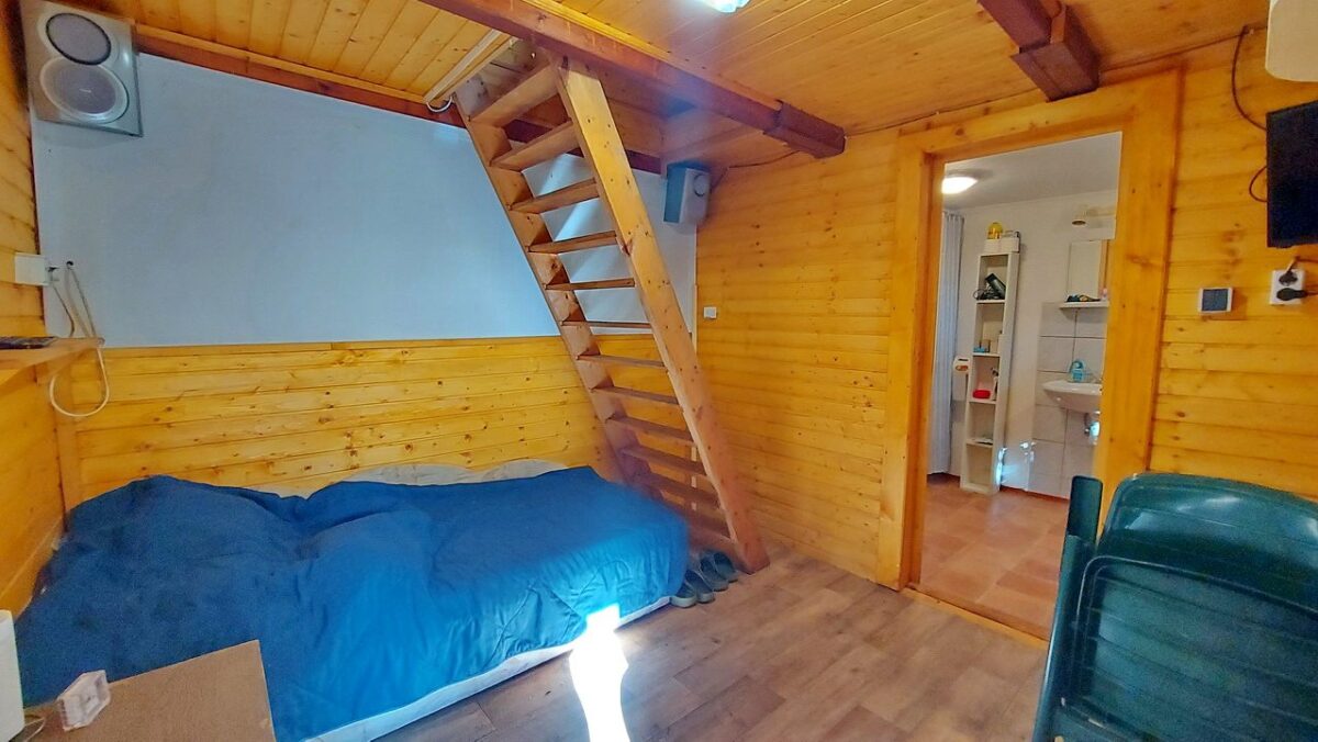 A szobából vezet a lépcső a tetőtérbe, ahol egy hálószoba van (8 m2).