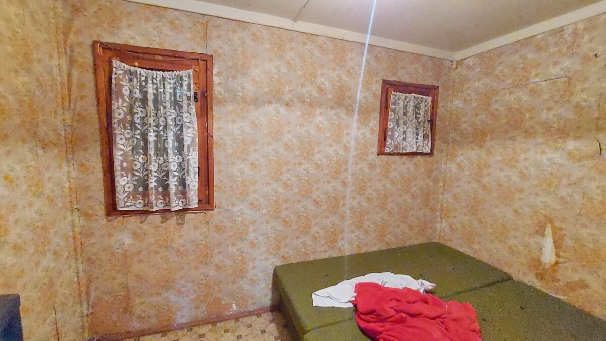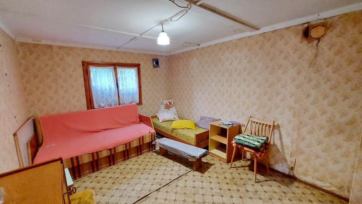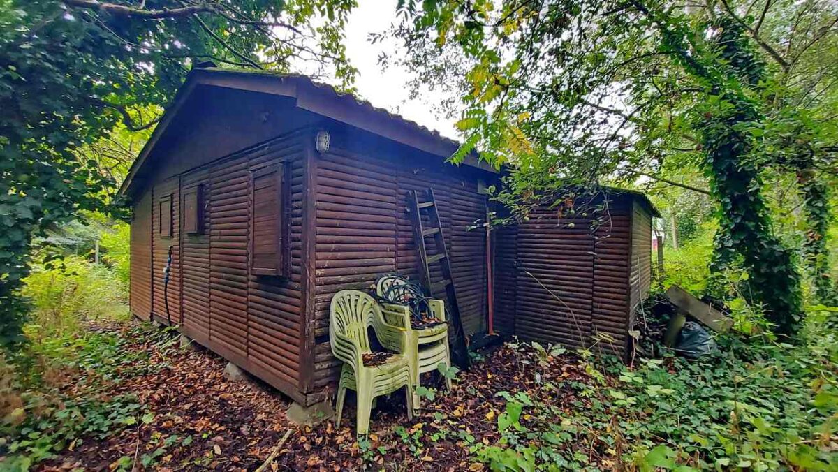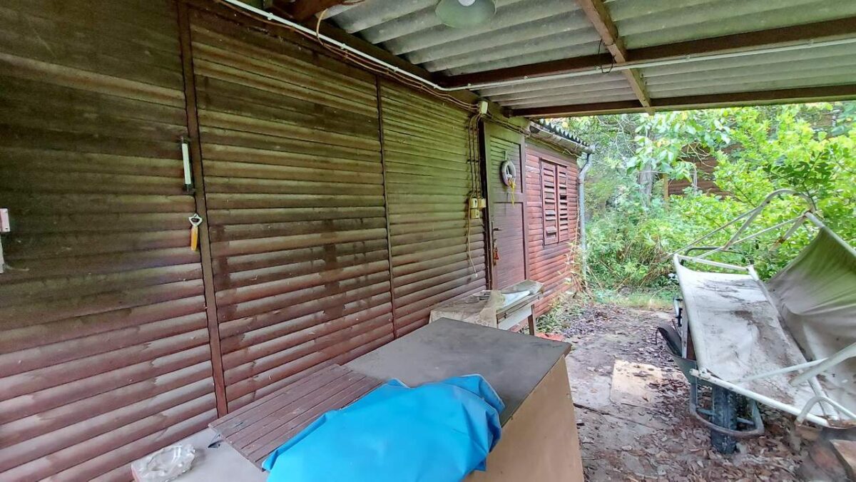 A beton tömbökre telepített felújítandó faház tetejét hullámpala fedi.