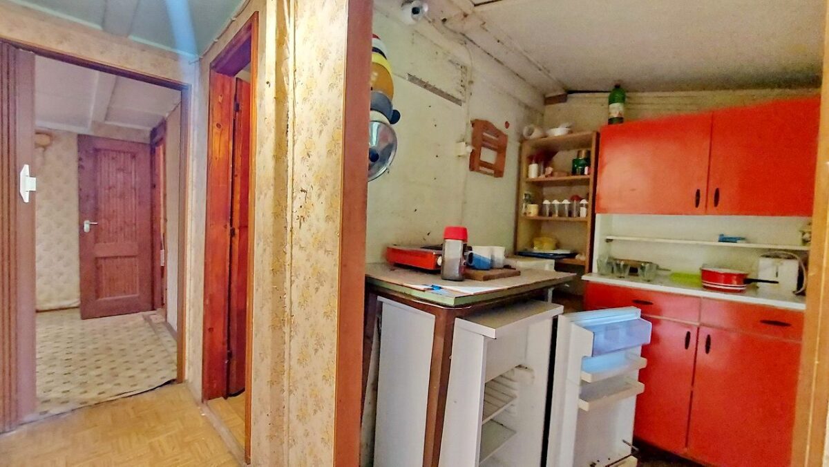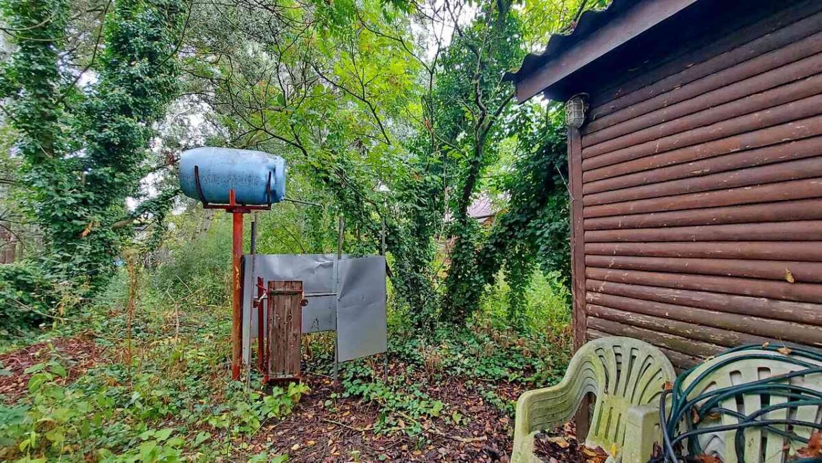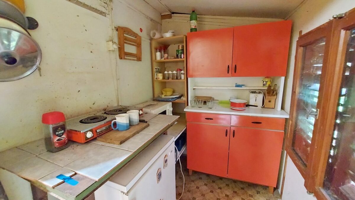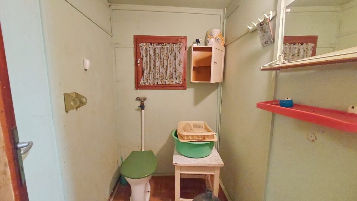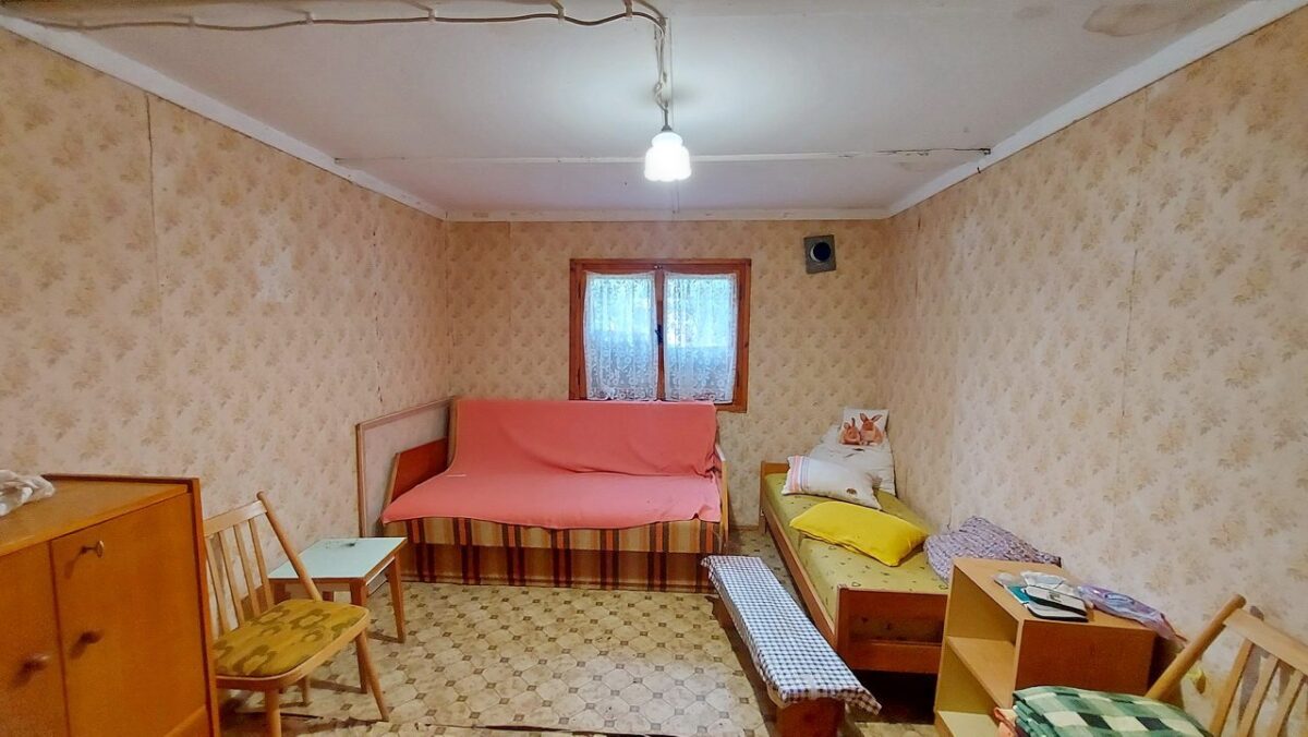 A beton tömbökre telepített felújítandó faház tetejét hullámpala fedi.