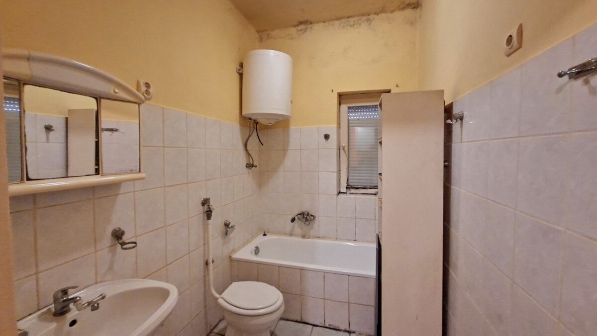 A fürdőszoba (4,5 m2) a közlekedőből nyílik, amelyben kád, wc és kézmosó van, valamint jut hely a mosógépnek is. A falakon és a padlón hidegburkolat van, valamint a fürdőszobának is van ablaka. A használati meleg vizet nyújtó elektromos bojler is ebben a helyiségben van.