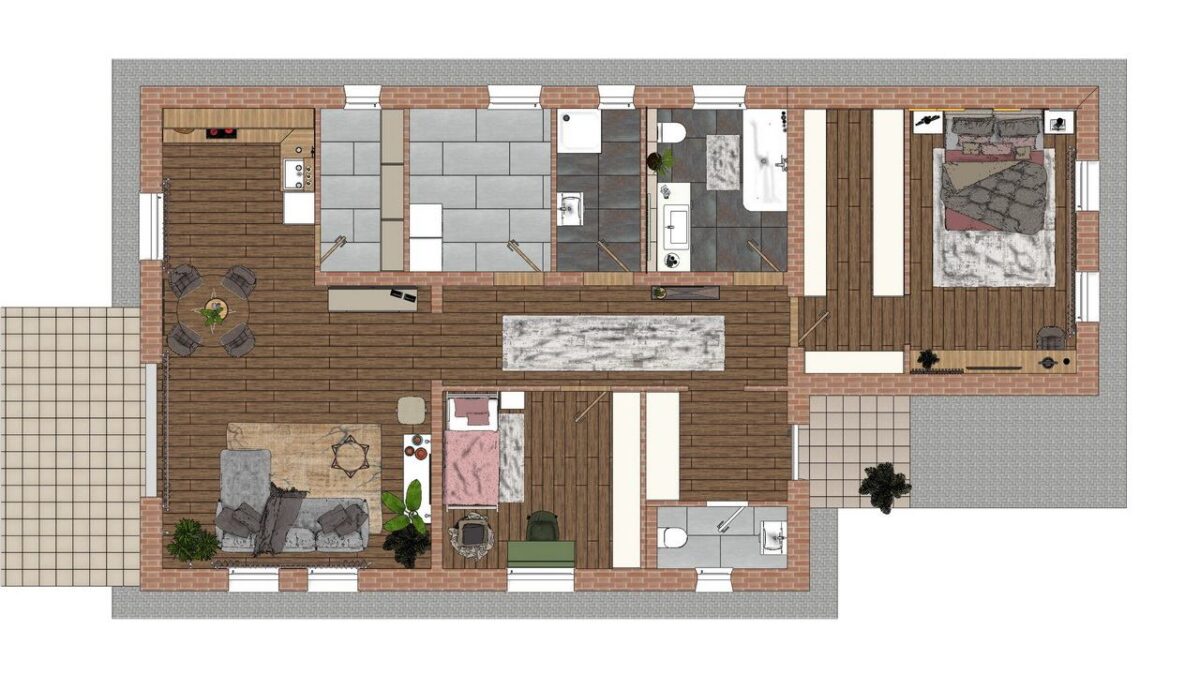 A képek közötti alaprajzon látható a családi ház helyiségeinek elhelyezkedése és méretei. A belmagasság 2,7 m.