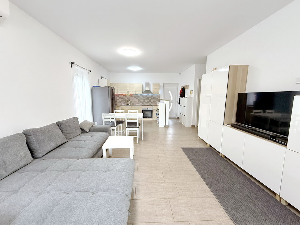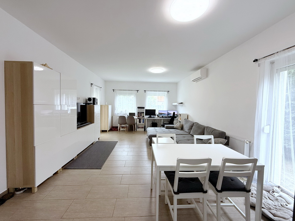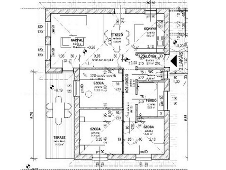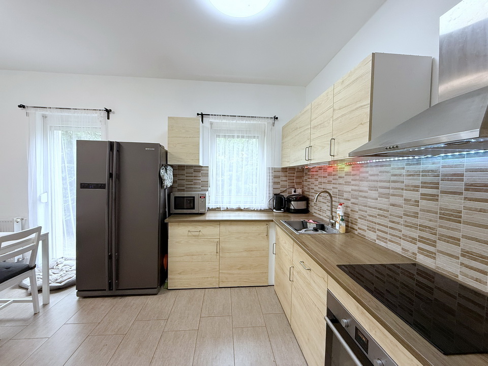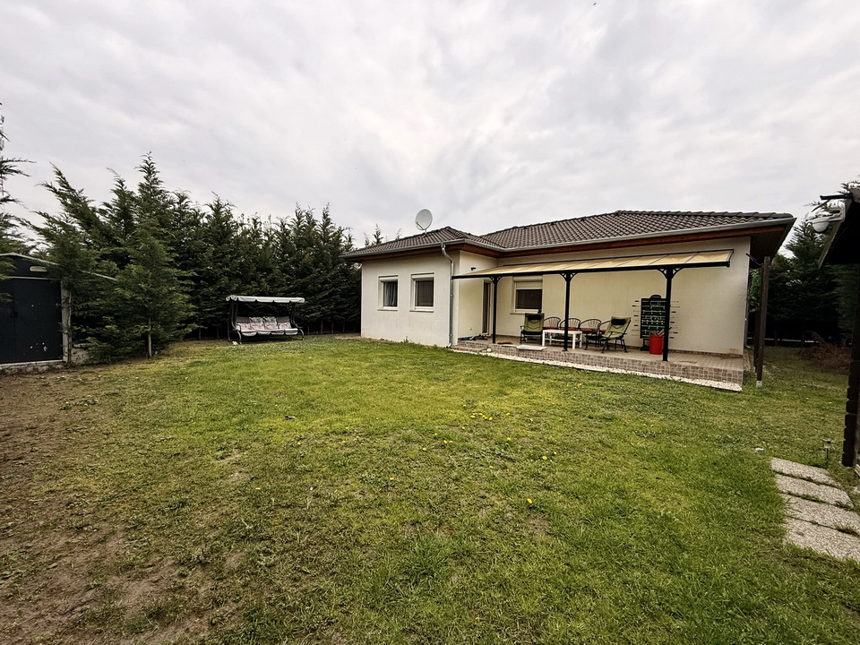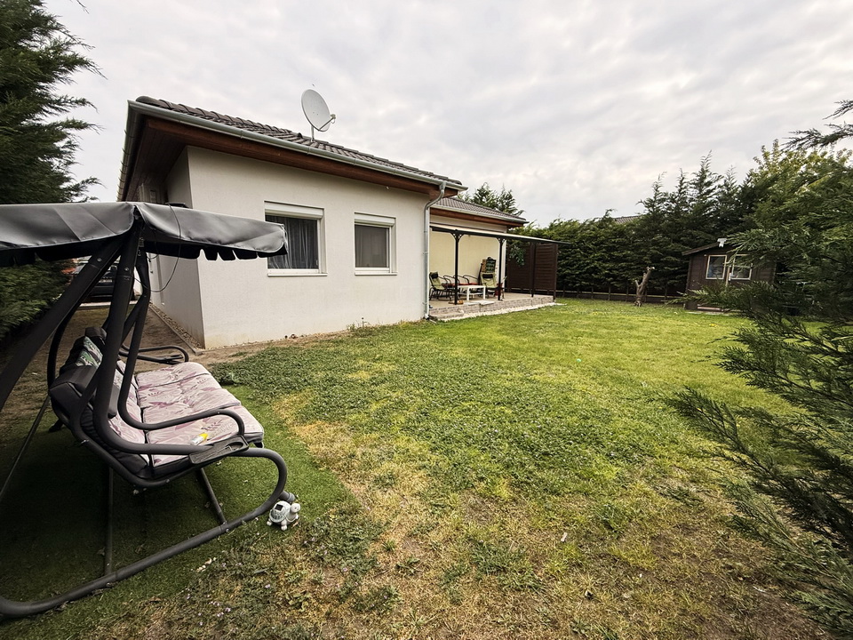 A földszintes ingatlanban található egy külső tároló, majd a házba belépve előtér, terasz kapcsolatos amerikai konyhás nappali, 3 hálószoba, külön WC és kádas fürdőszoba.