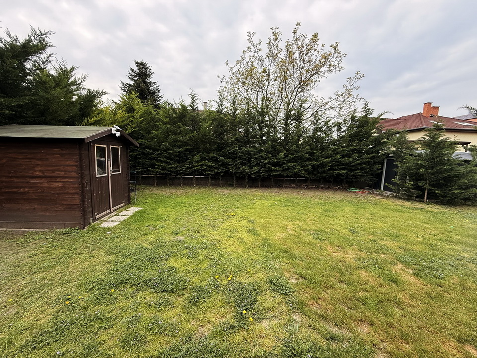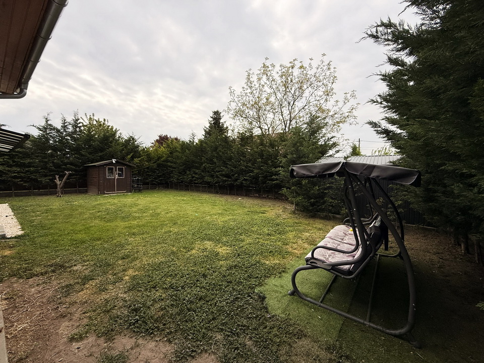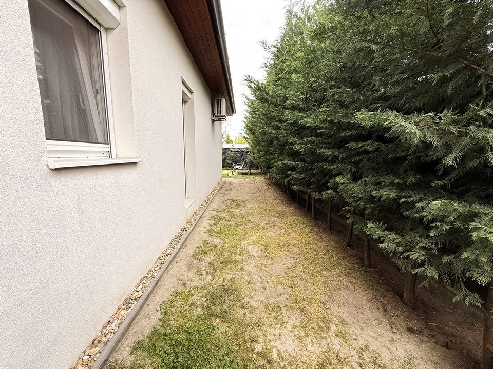 A házhoz tartozó 473 m2-es telek teljes egészében tujákkal és igényes kerítéssel körülölelt, így egy igazán intim, nyugodt életteret biztosít a család számára. A nyeles telek kialakításának köszönhetően az egyébként is csendes utcáról érkező minimális zaj sem hallatszik be.