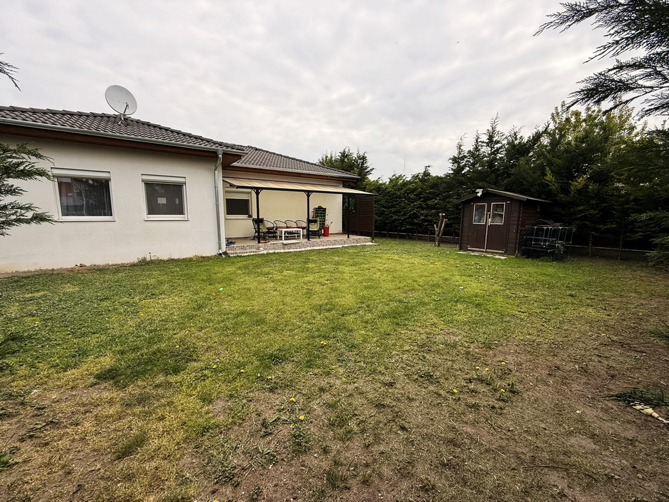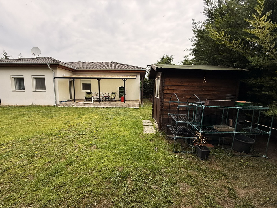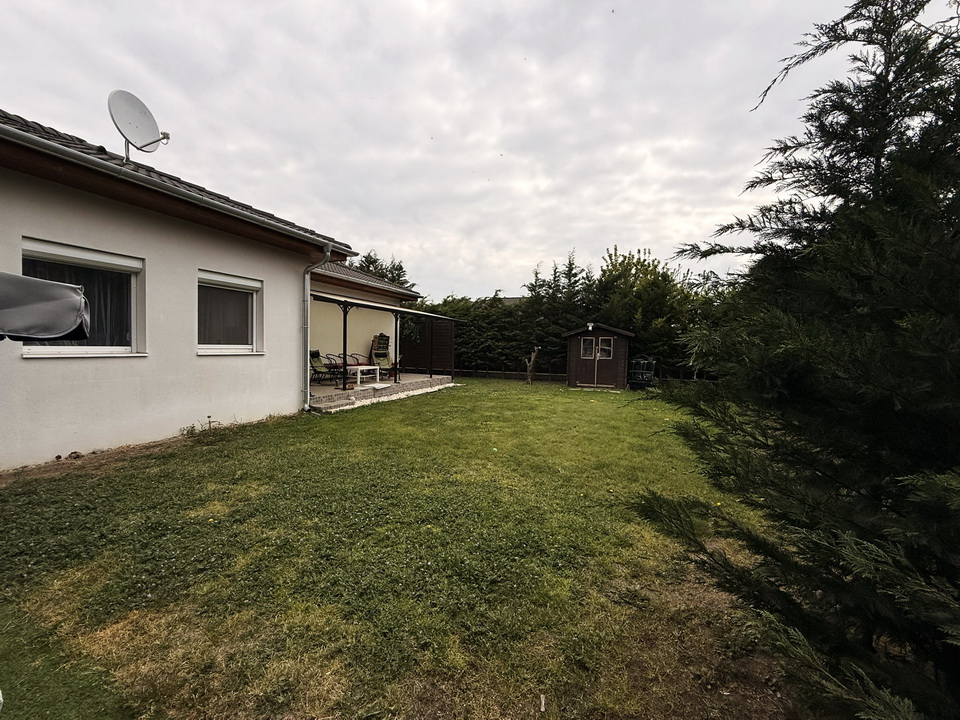 A kertben egy fedett terasz, valamint több kerti tároló is helyet kapott.