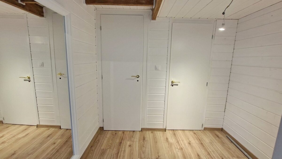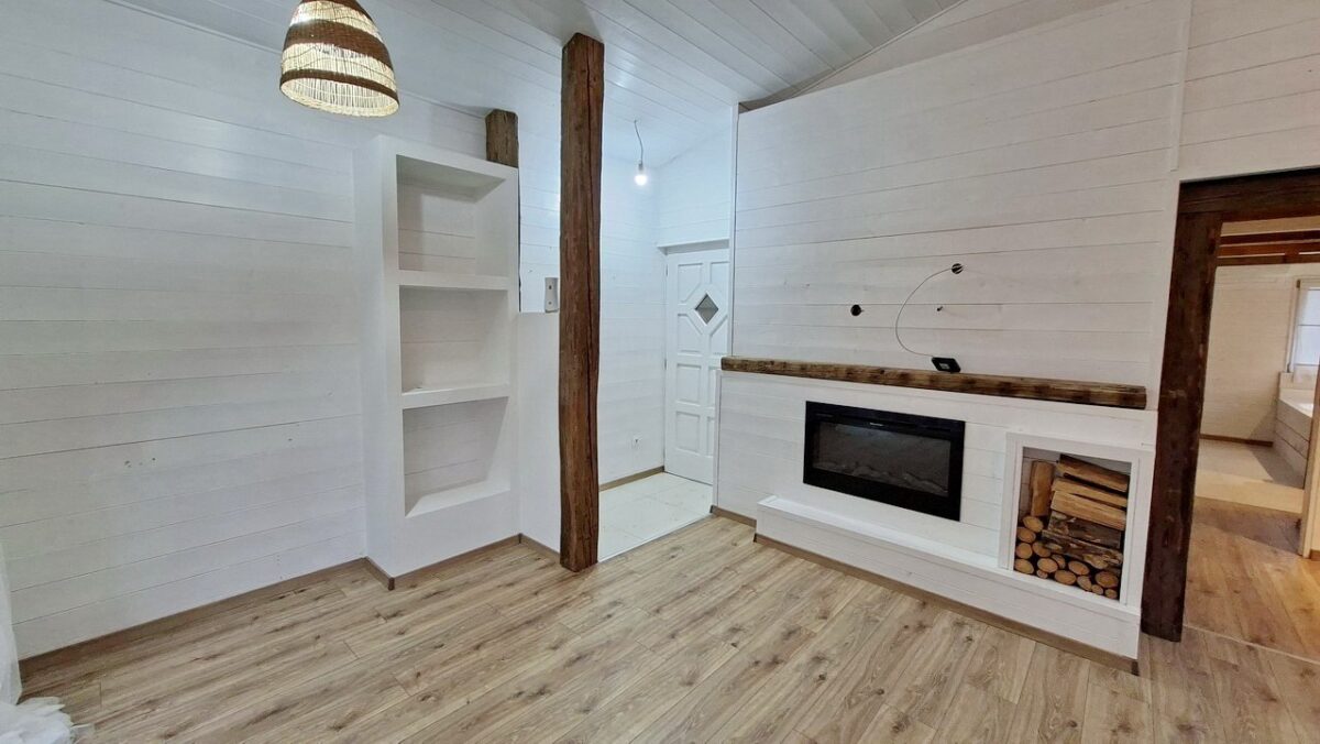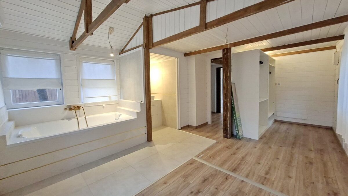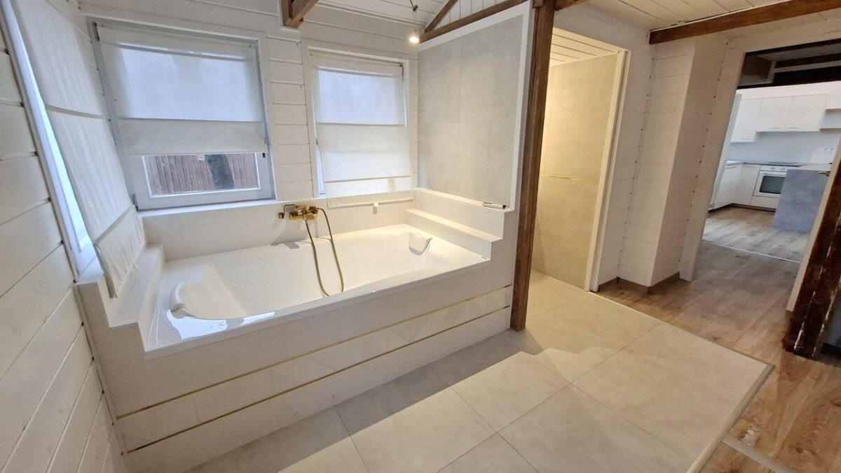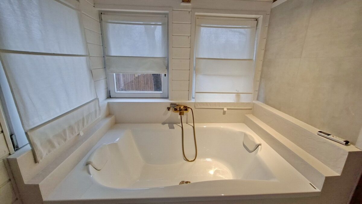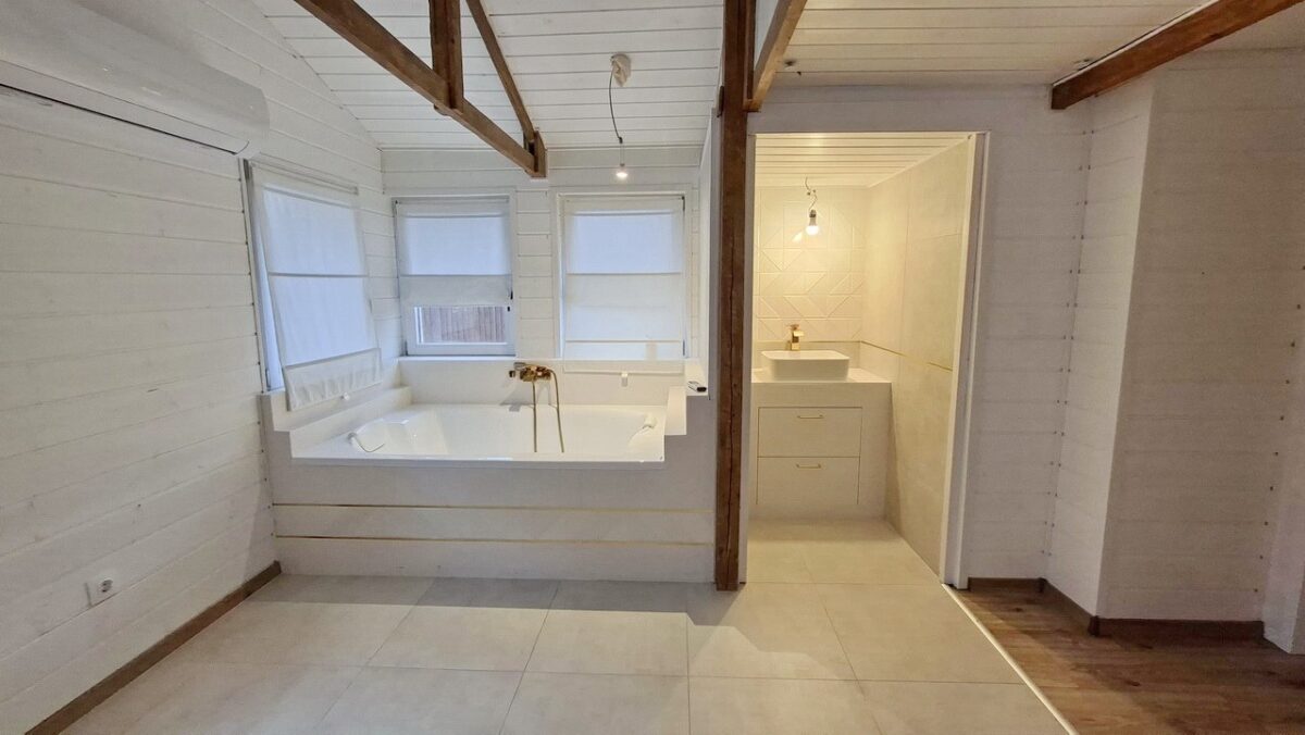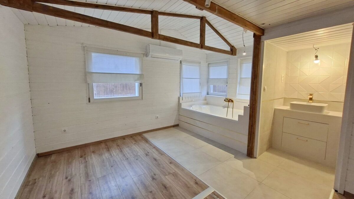 A szintén kiváló szalagparkettával burkolt és sok ablakától világos szoba egyik sarkába telepített nagy méretű kád teljesen egyedivé teszi ezt a nyaralót.