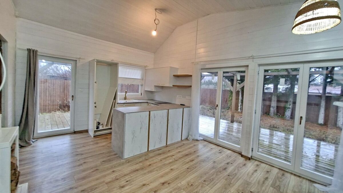 A nappali és a konyha felületről is közvetlenül lehet a hatalmas, „L” alakú teraszra kilépni.