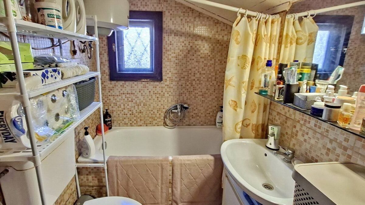 A fürdőszoba (4 m2) padlózatán és a falakon hidegburkolat van. A vizesblokknak is van ablaka így a természetes szellőztetés könnyen megoldható. A használati meleg vizet elektromos bojler biztosítja.