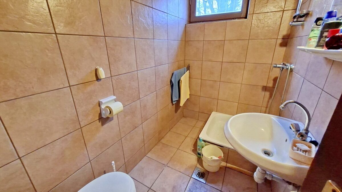 A lépcső mellett nyílik a fürdőszoba, amelyben zuhanyzó, wc és kézmosó van. A vizesblokknak is van ablaka, így a szellőztetés természetes módon oldható meg. A padlózaton és a falakon hidegburkolat van. A használati meleg vizet adó elektromos bojler a tárolóban van elhelyezve, így nem vesz el helyet a fürdőszobából.