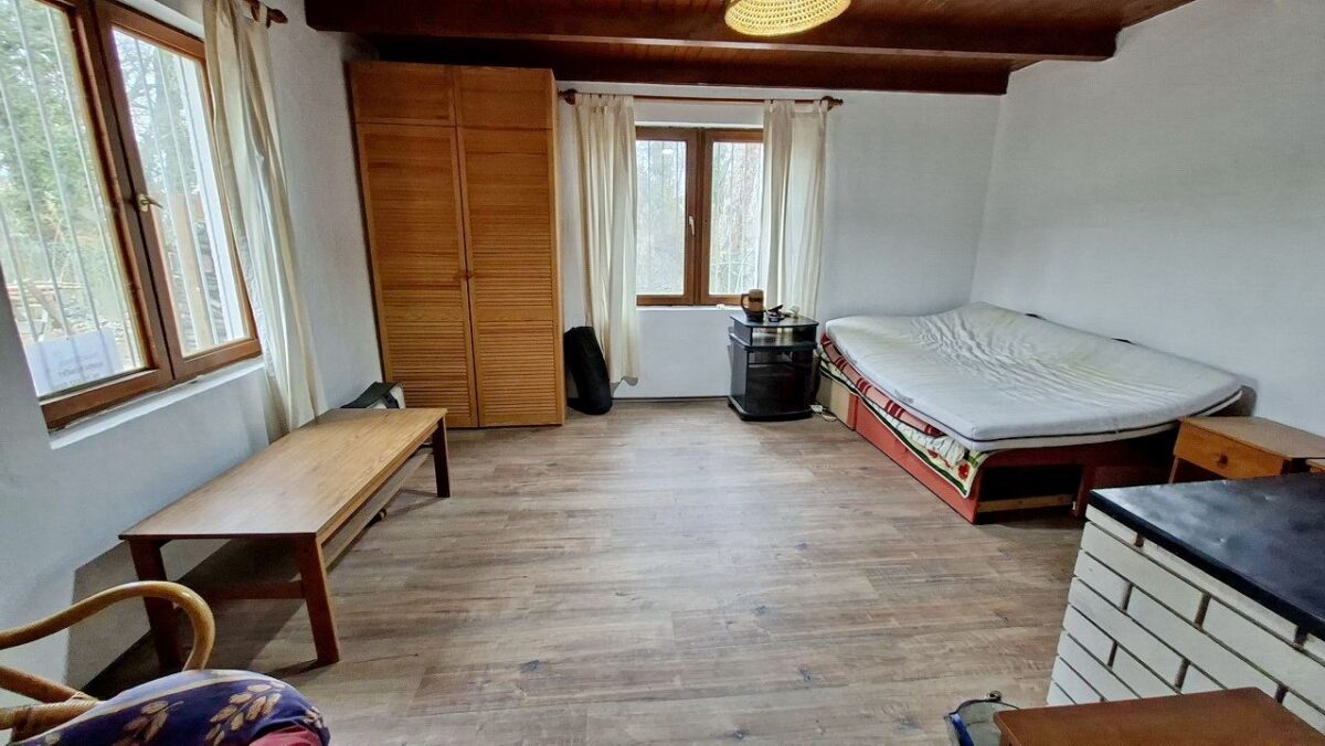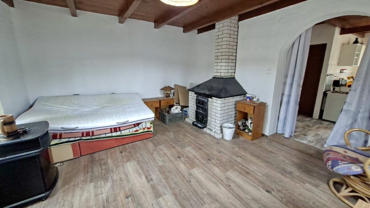 A nappali ablakai a terasz és a medence felé néznek, a fa tüzeléses kandalló is ebben a helyiségben van. A padlóburkolat laminált parketta.