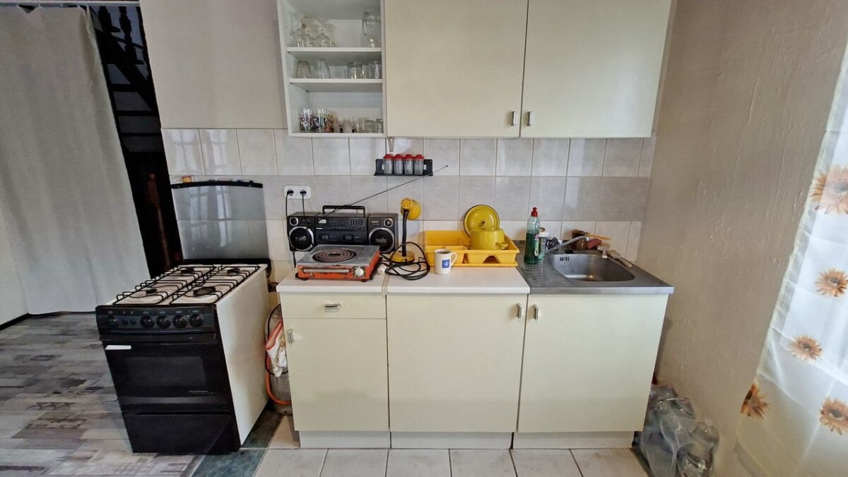 A teraszról léphetünk a házba, a tágas és természetes fénytől világos étkező-konyha helyiségbe érkezve. A konyha padlózatán kerámia járólap a padlóburkolat, a többi területen laminált parketta van.