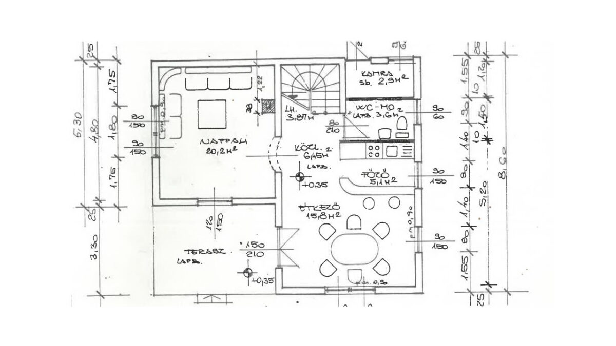 A telek területe 551 m2, az épület lakótere a két szinten összesen 113 m2, ebből a tetőtéri szobák (tetősíkok) miatt a hasznos alapterület 90 m2.