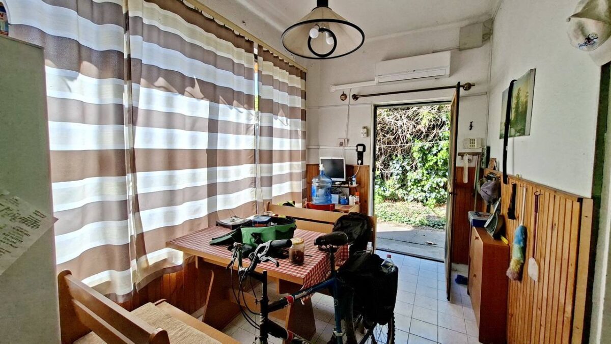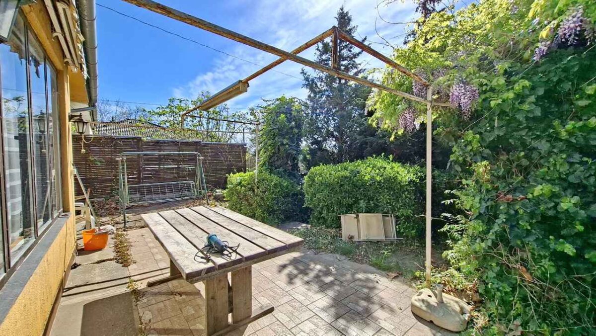 A ház mögötti terasz különös nyugalmat áraszt, ideális kültéri étkező.