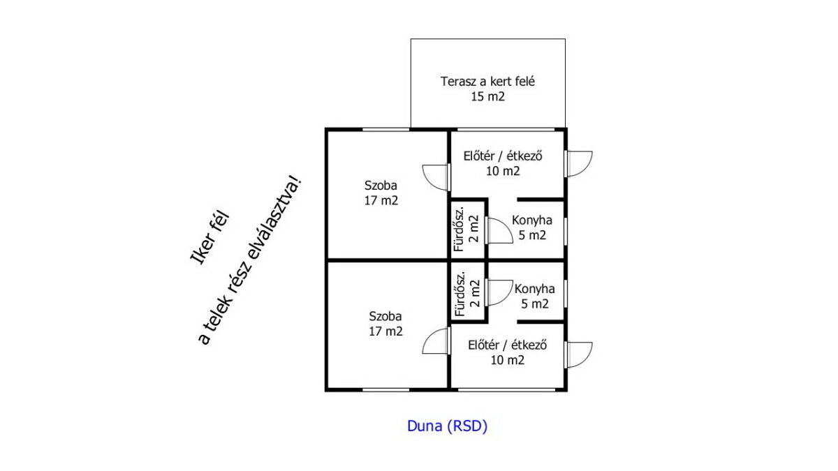 A képek közötti alaprajz szerint 2 x 34 m2, szimmetrikus lakrész van kialakítva. Igény esetén összenyitható.