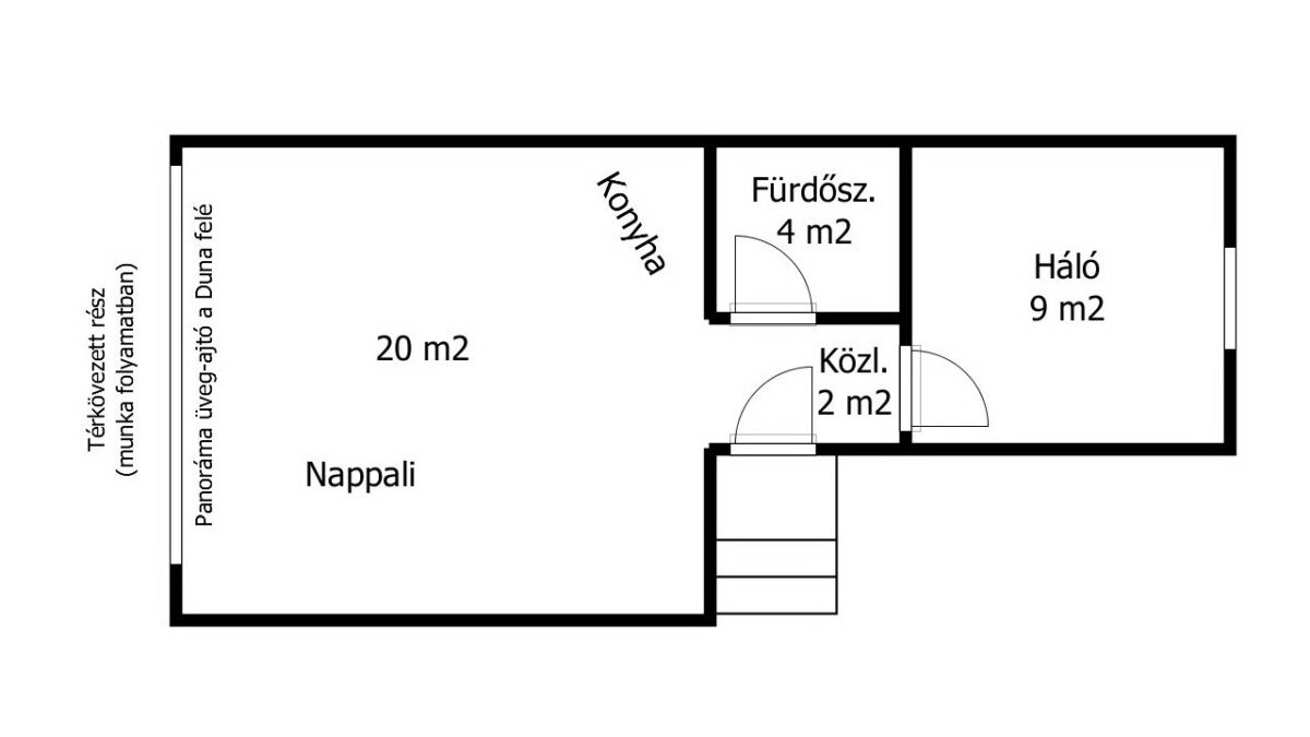 Az előszoba/közlekedőbe (2 m2) érkezünk, amelyből balra nyílik a nappali (20 m2), amelynek egyik sarkában kerül kialakításra a konyha-sarok. A konyha fölött szag/gőz elszívó kialakítása is megtörtént. A hatalmas, elhúzható panoráma ablak/ajtó páratlan látványt biztosít a Ráckevei-Soroksári Dunára (RSD). Ebben a helyiségben kerámia járólap a padlózat burkolata.